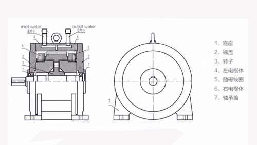 CW型電渦流制動(dòng)器由轉(zhuǎn)子(帶有槽輪)、定子(包括左右電樞體、勵(lì)磁線圈、端蓋、軸承蓋)、機(jī)座組成。 2.CW電渦流制動(dòng)器的工作原理 當(dāng)與轉(zhuǎn)子同軸裝配的勵(lì)磁線圈通有直流電視時(shí),其產(chǎn)生的磁通經(jīng)電樞體、渦流環(huán)、氣隙和轉(zhuǎn)子形成磁閉合回路。由于轉(zhuǎn)子外圈面被制成均勻分布的齒和槽,故在氣隙和渦流環(huán)內(nèi)表面產(chǎn)生疏密詳見(jiàn)的磁場(chǎng)。因此,當(dāng)轉(zhuǎn)子被拖動(dòng)旋轉(zhuǎn)時(shí),在渦流環(huán)內(nèi)表面的任一點(diǎn)的磁場(chǎng)產(chǎn)生交變變化,由此感應(yīng)出,該“渦流”所形成的磁場(chǎng)又與原氣隙磁場(chǎng)相互作用,在轉(zhuǎn)子上就產(chǎn)生了制動(dòng)力矩。動(dòng)力機(jī)輸出的功率被轉(zhuǎn)化成渦流環(huán)上“渦流”產(chǎn)生的等值發(fā)熱量,該熱量由進(jìn)入渦流環(huán)冷卻水槽中持續(xù)不斷的冷卻水帶走。 電渦流制動(dòng)器主要技術(shù)參數(shù):