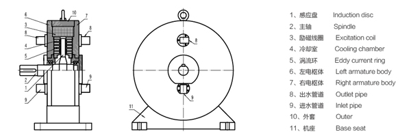 當(dāng)激磁線圈通上直流電時(shí),其產(chǎn)生的磁通經(jīng)左右電樞體、渦流環(huán)、感應(yīng)盤,形成閉合磁路,有與轉(zhuǎn)子形狀猶如直齒輪,當(dāng)感應(yīng)盤被原動(dòng)機(jī)帶動(dòng)旋轉(zhuǎn)時(shí),渦流環(huán)內(nèi)表面產(chǎn)生疏密相間的磁場,該磁場在渦流環(huán)的表面上任一點(diǎn)呈交變變化,因此在渦流環(huán)內(nèi)表面及一定深度范圍內(nèi)產(chǎn)生渦流,由于渦流形成的磁場與原磁場的相互作用,在感應(yīng)盤上就產(chǎn)生了制動(dòng)力矩。